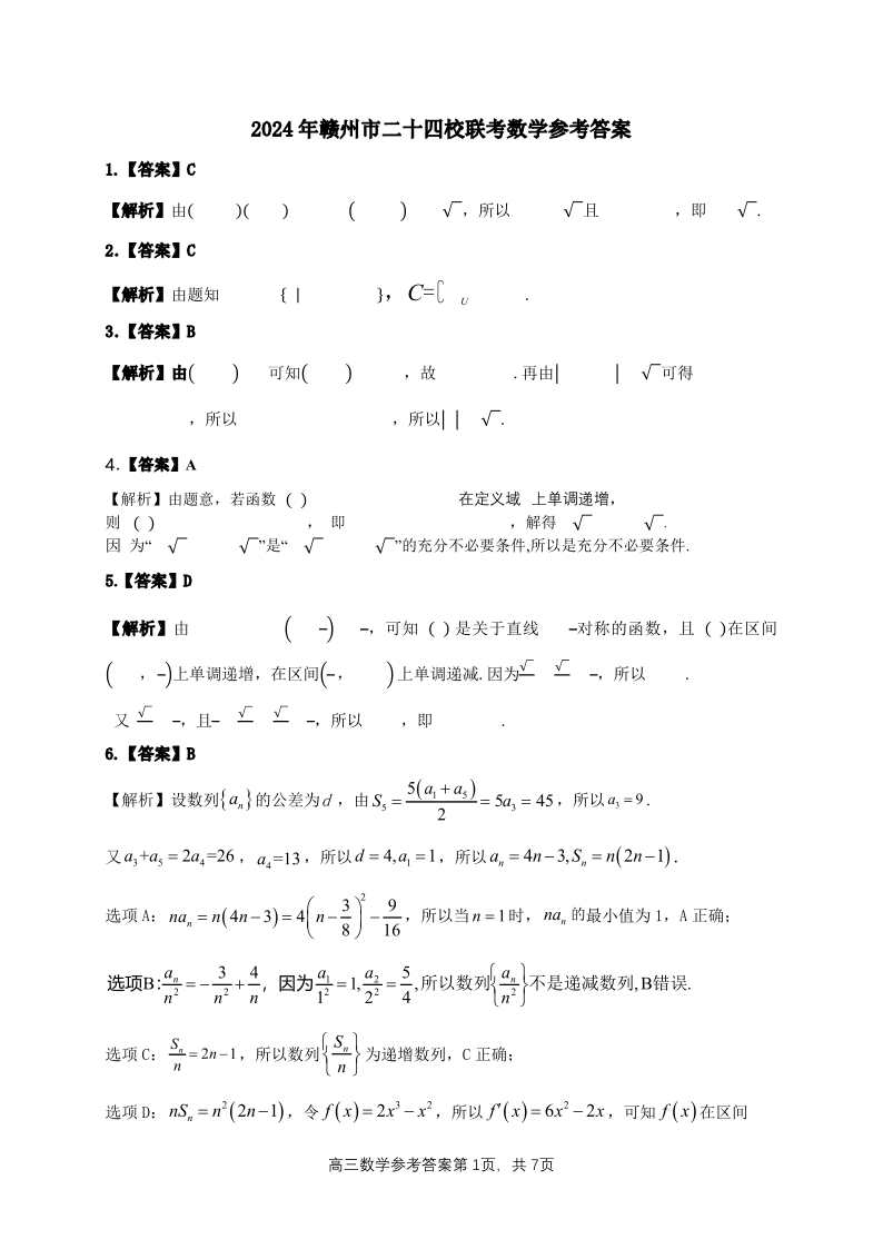 江西省赣州市十八县(市、区)二十四校2025届高三上学期期中考试数学参考答案