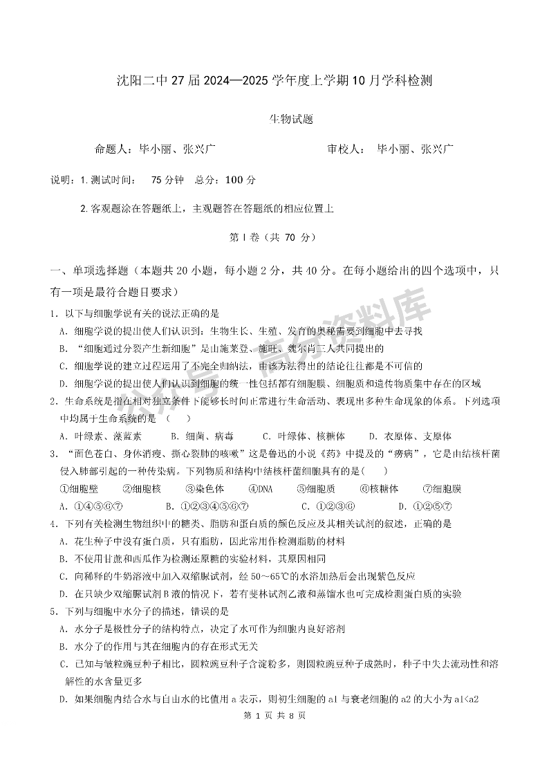辽宁省沈阳市第二中学2024-2025学年高一上学期10月月考生物试题