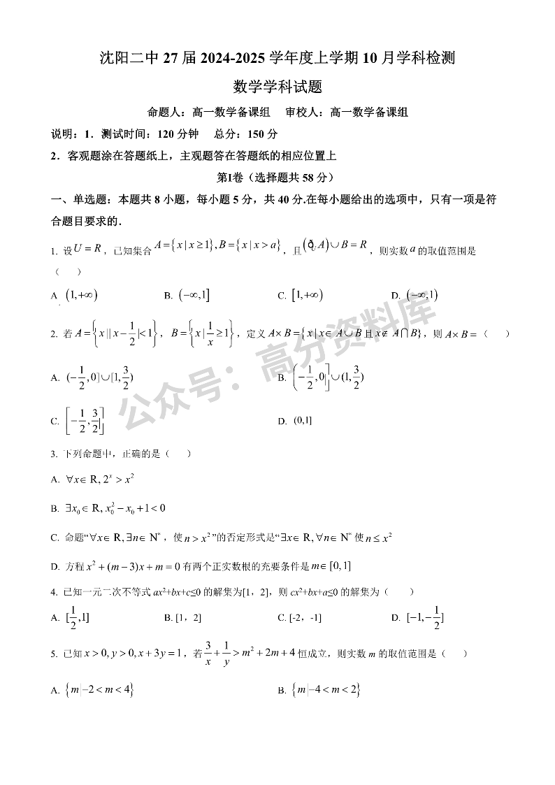 辽宁省沈阳市第二中学2024-2025学年高一上学期10月学科检测试题 数学 含答案