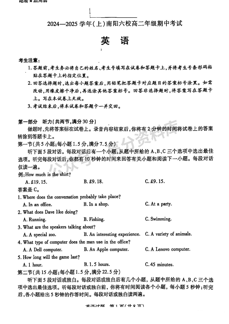 河南省南阳市六校2024-2025学年高二上学期10月期中考试 英语
