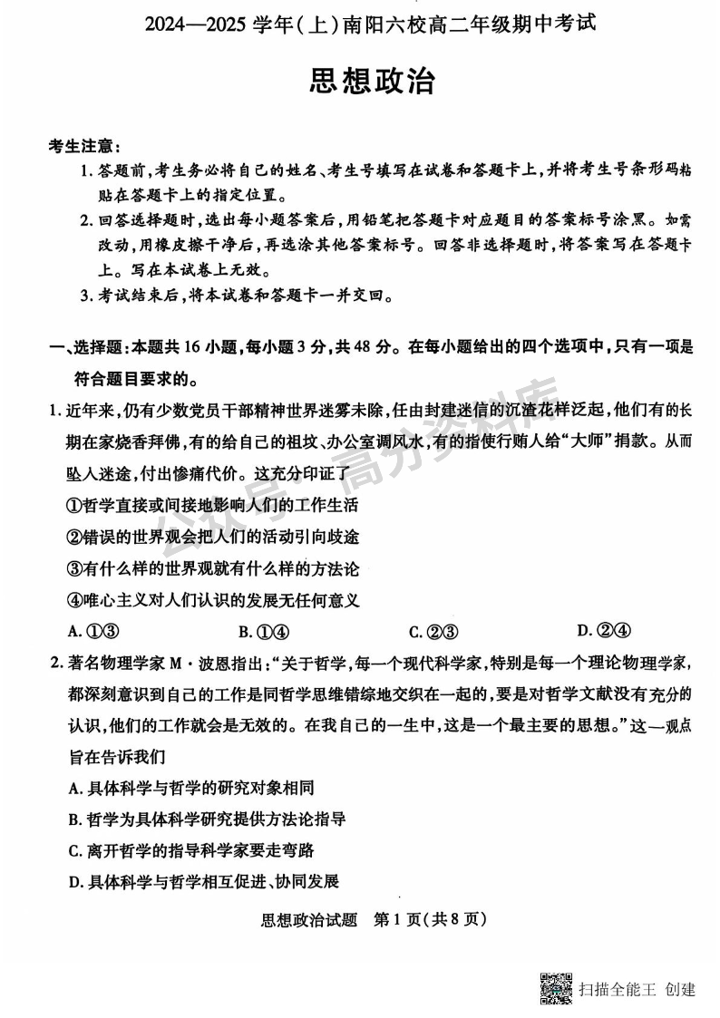 河南省南阳市六校2024-2025学年高二上学期10月期中考试 政治 含答案