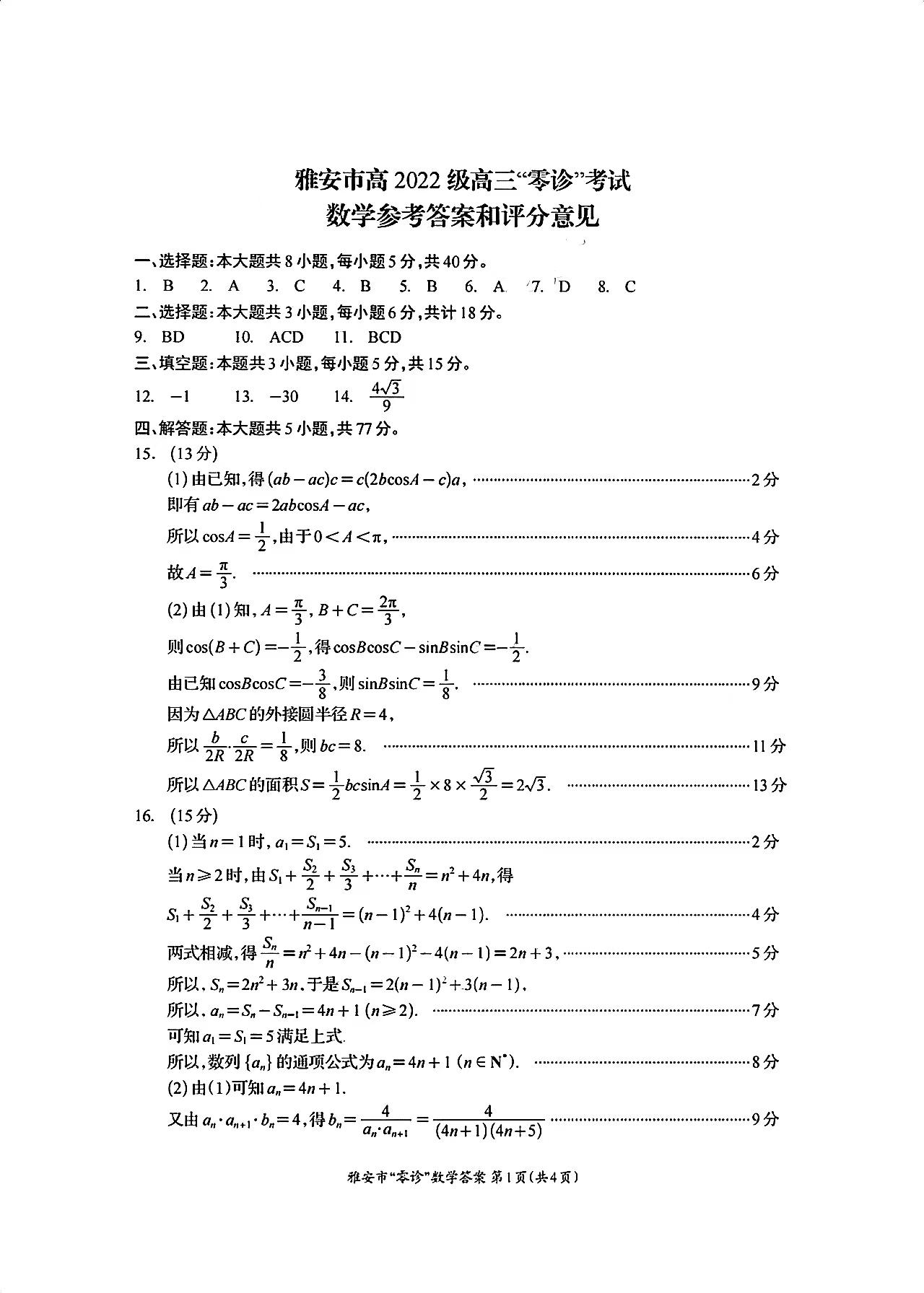 四川省雅安市2024-2025学年高三上学期11月零诊 数学答案