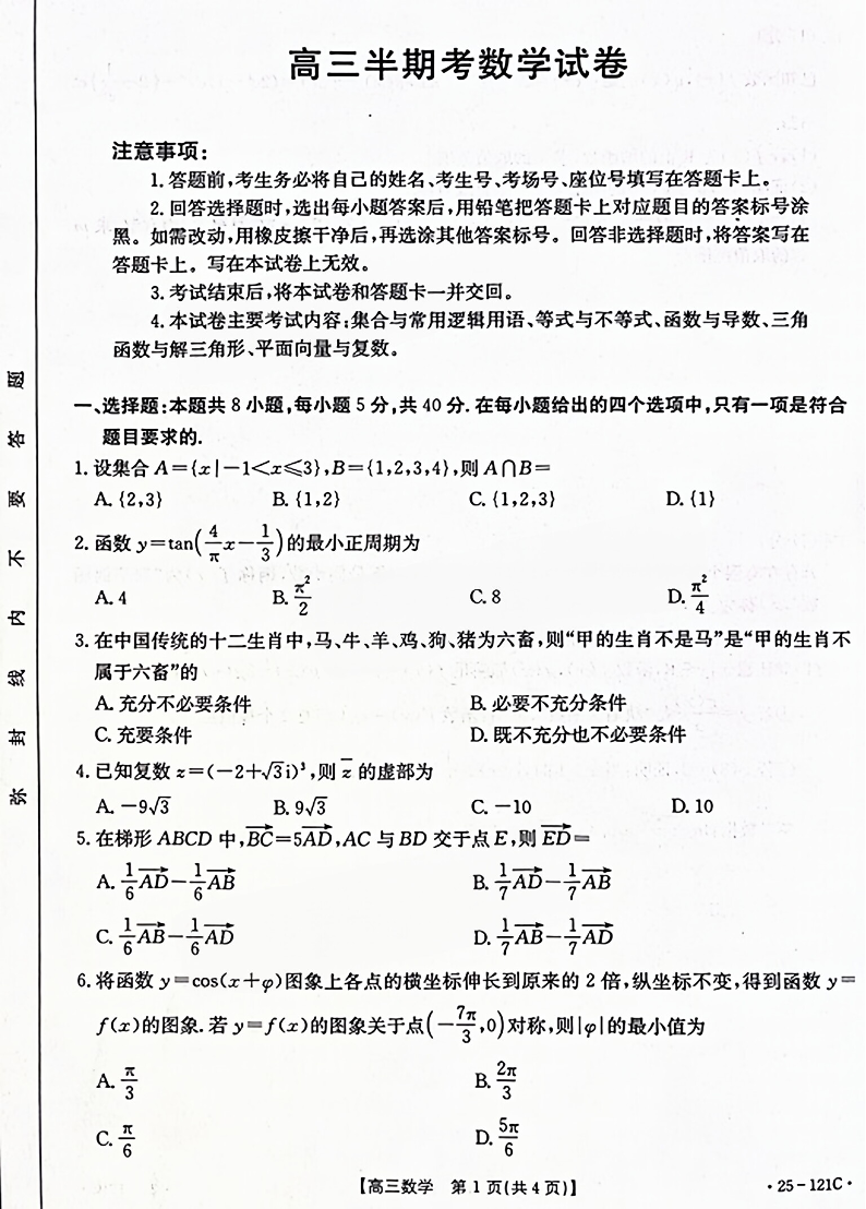 【福建卷】福建省漳州宁德龙岩三市2025届高三百校半期11月联考联考 数学试卷