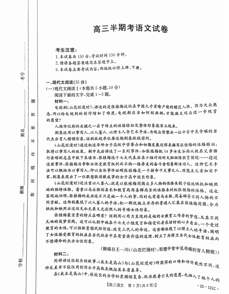 【福建卷】福建省漳州宁德龙岩三市2025届高三百校半期11月联考联考 语文试卷+参考答案