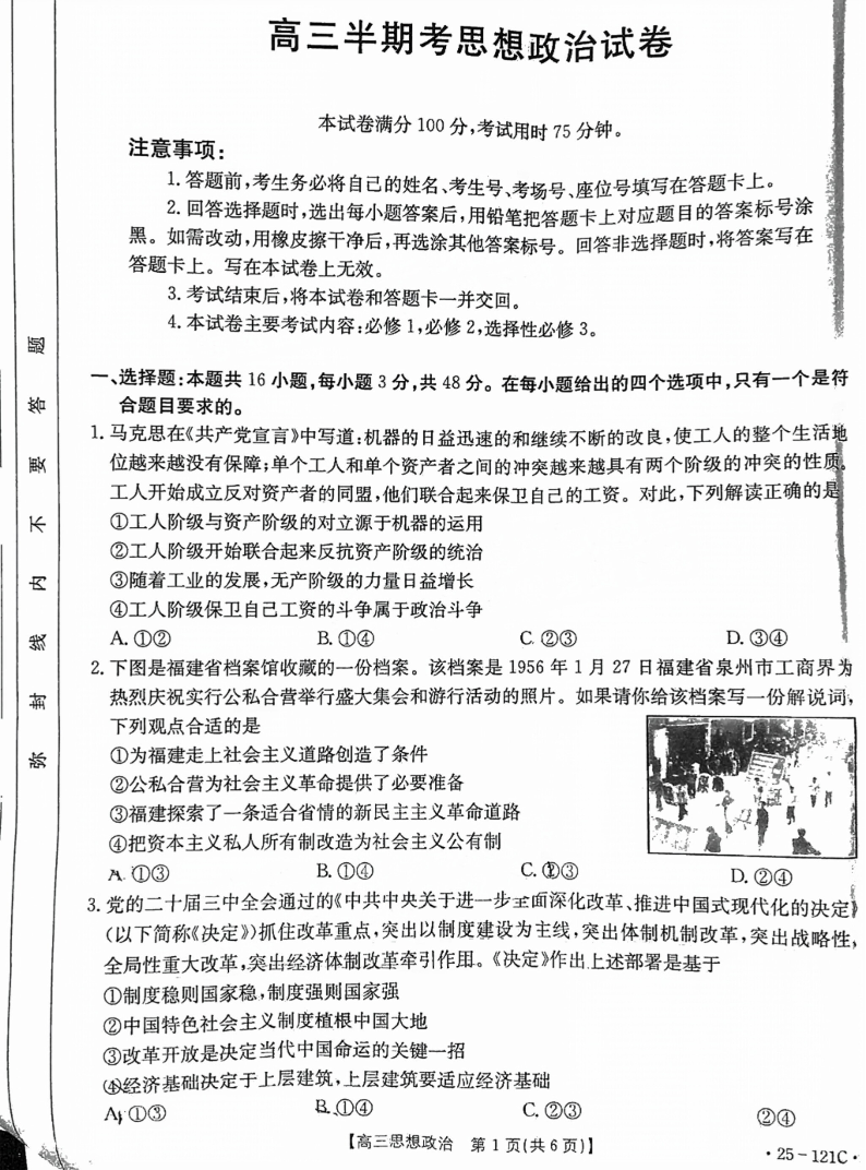 【福建卷】福建省漳州宁德龙岩三市2025届高三百校半期11月联考联考 政治试卷+参考答案