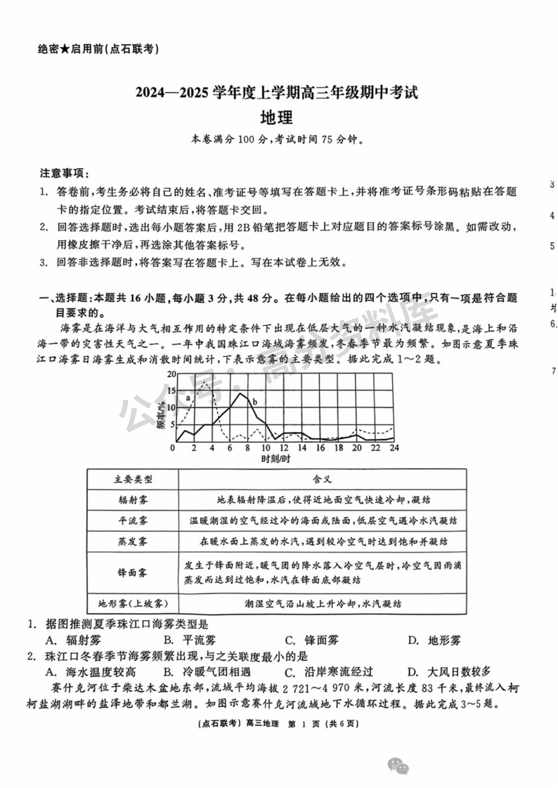 辽宁省点石联考2025届高三期中考试 地理试题及参考答案