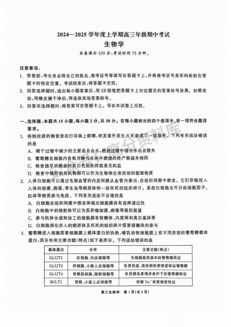 辽宁省点石联考2025届高三期中考试 生物试题及参考答案