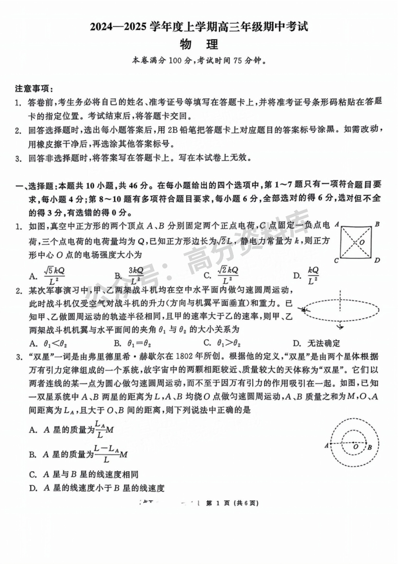 辽宁省点石联考2025届高三期中考试 物理试题及参考答案