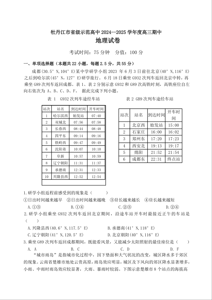 黑龙江省牡丹江市省级示范高中2024-2025学年高三上学期期中考试 地理 Word版含答案