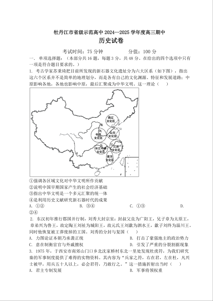 黑龙江省牡丹江市省级示范高中2024-2025学年高三上学期期中考试 历史 Word版含答案