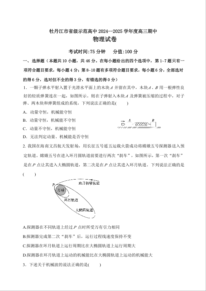 黑龙江省牡丹江市省级示范高中2024-2025学年高三上学期期中考试 物理 Word版含答案