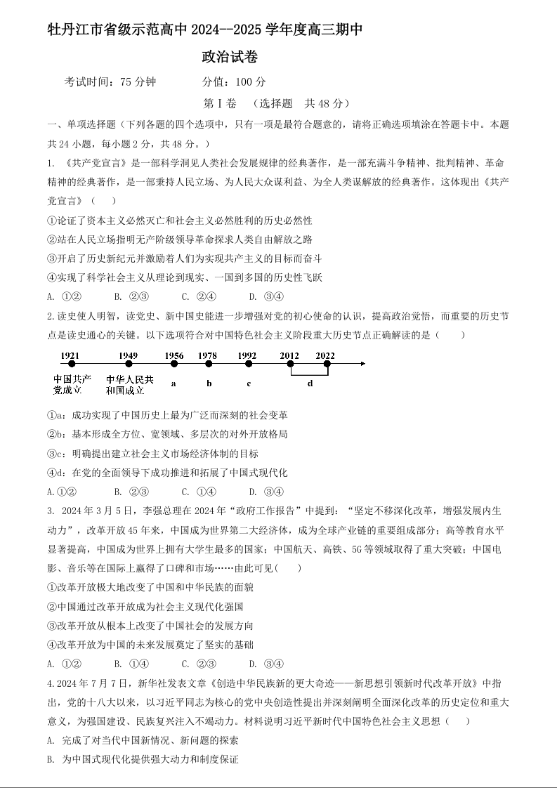 黑龙江省牡丹江市省级示范高中2024-2025学年高三上学期期中考试 政治 Word版含解析