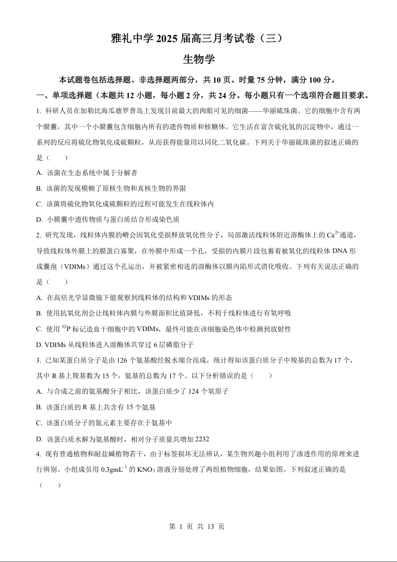 湖南省长沙市雅礼中学2025届高三11月考卷(三) 生物试题(原卷版)