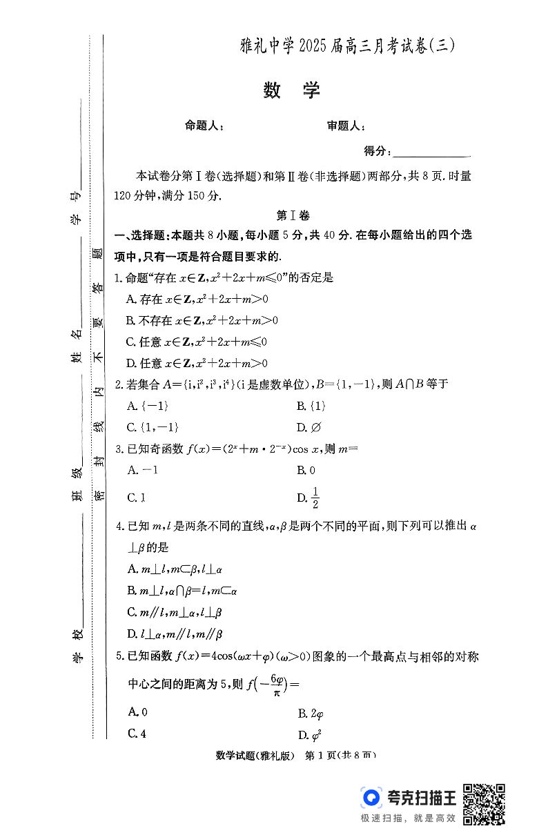 湖南省长沙市雅礼中学2025届高三11月考卷(三) 数学