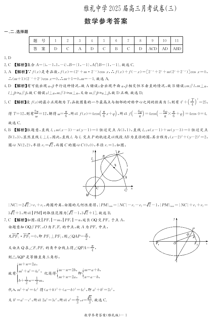 湖南省长沙市雅礼中学2025届高三11月考卷(三) 数学答案