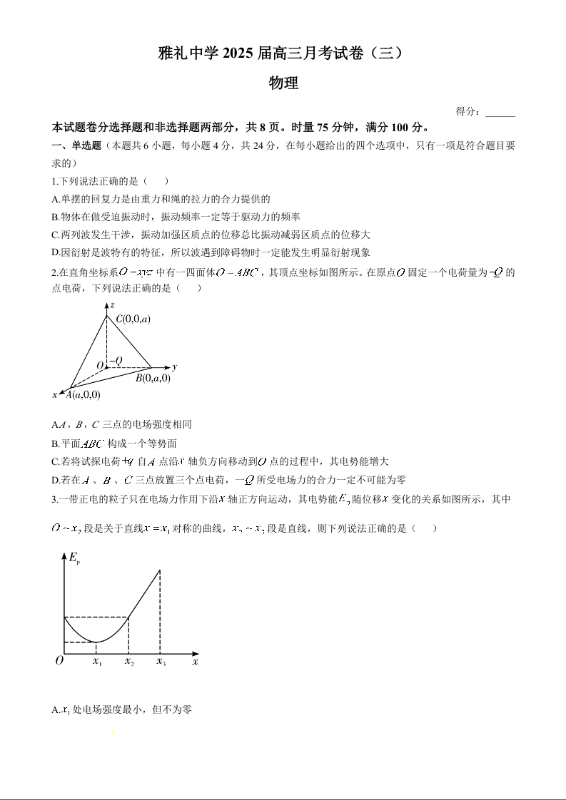 湖南省长沙市雅礼中学2025届高三11月考卷(三)物理及答案