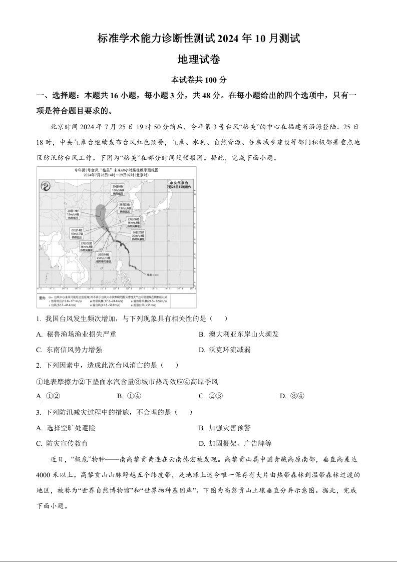中学生标准学术能力诊断性测试2024-2025学年高三上学期10月月考试题 地理 Word版含答案