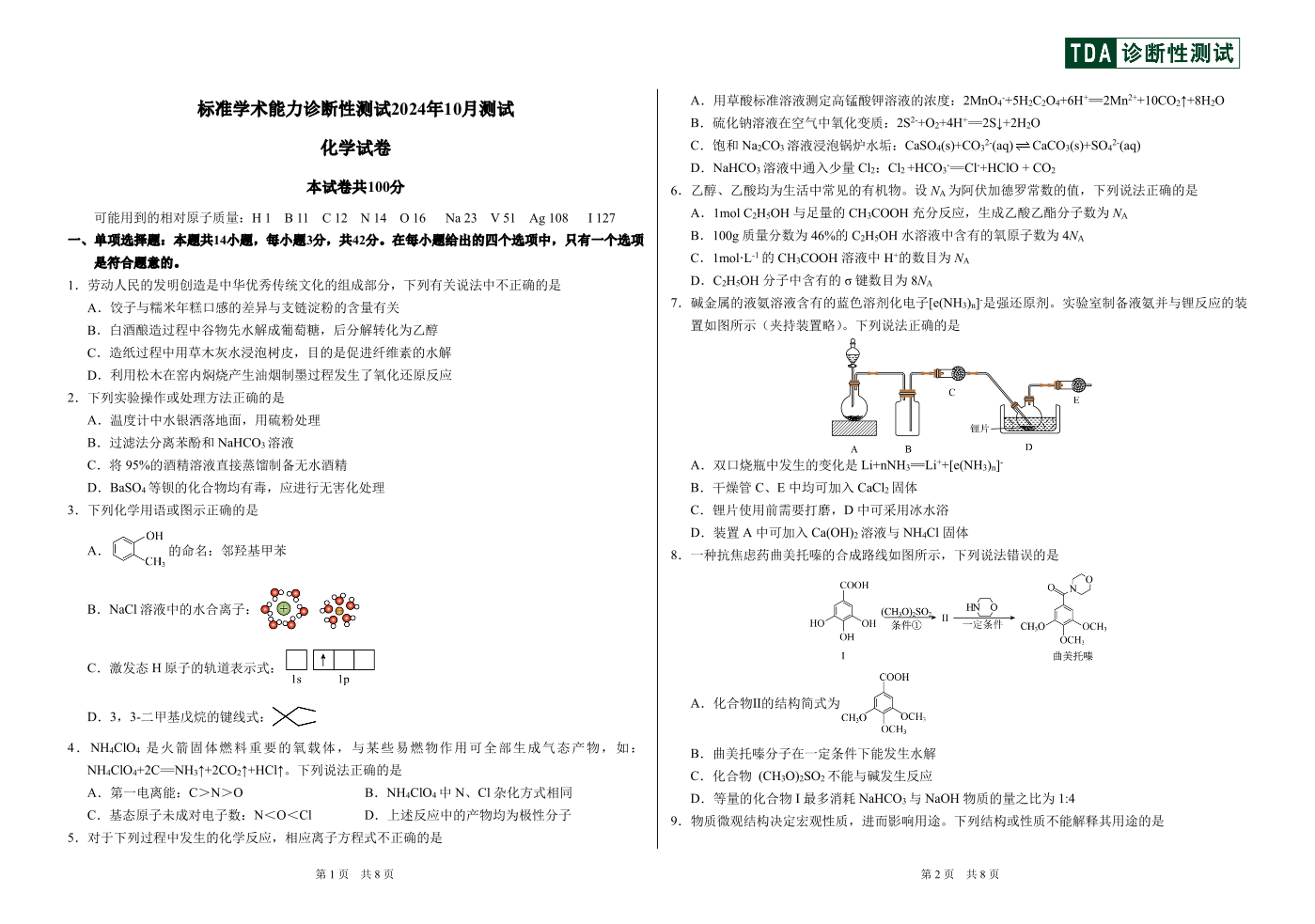 中学生标准学术能力诊断性测试2024-2025学年高三上学期10月月考试题 化学 PDF版含答案