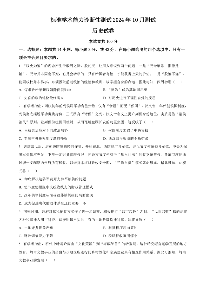 中学生标准学术能力诊断性测试2024-2025学年高三上学期10月月考试题 历史 Word版含答案
