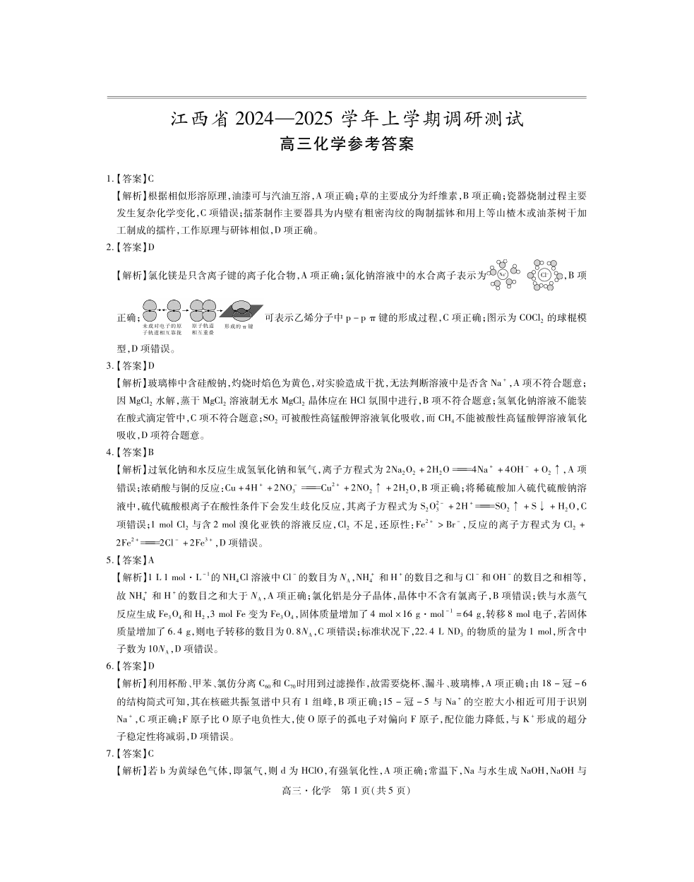 江西省上进联考2024-2025学年高三上学期11月期中调研测试 化学答案