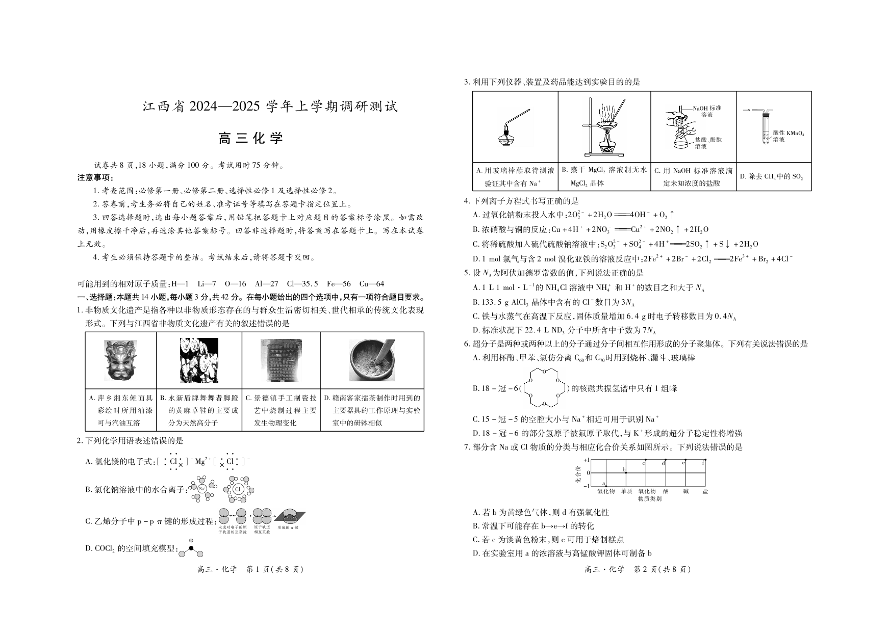 江西省上进联考2024-2025学年高三上学期11月期中调研测试 化学