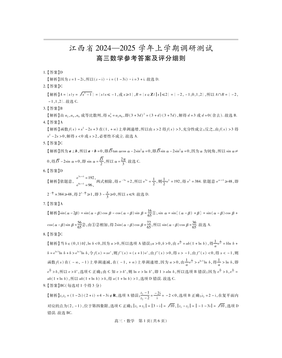 江西省上进联考2024-2025学年高三上学期11月期中调研测试 数学答案