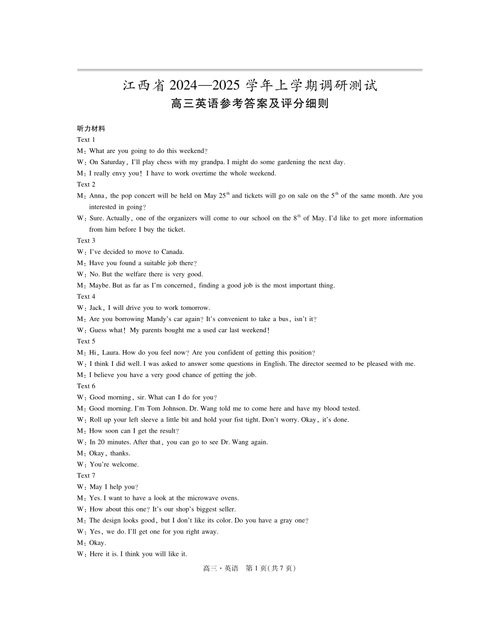 江西省上进联考2024-2025学年高三上学期11月期中调研测试 英语答案