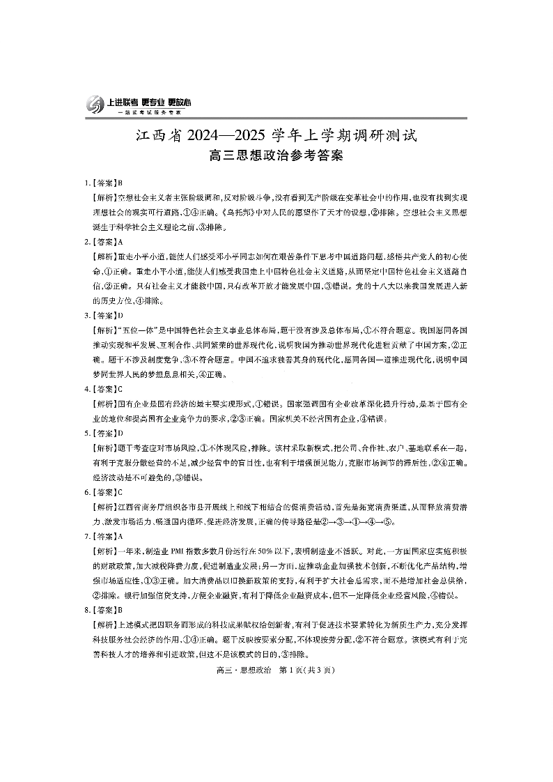 江西省上进联考2024-2025学年高三上学期11月期中调研测试 政治答案