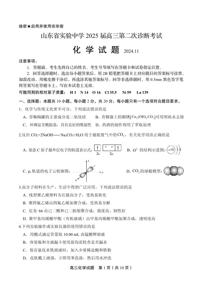 山东省实验中学2025届高三上学期11月期中考试 化学试题