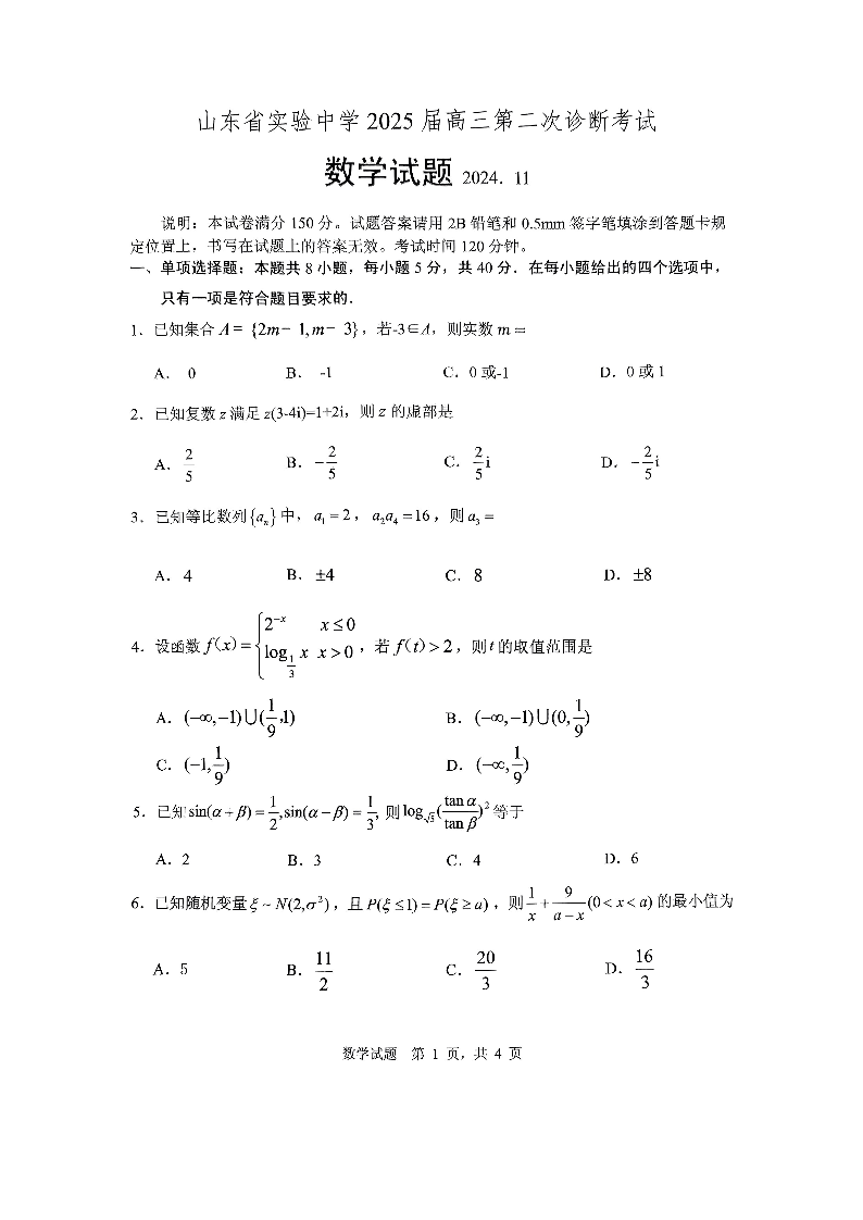 山东省实验中学2025届高三上学期11月期中考试 数学试题