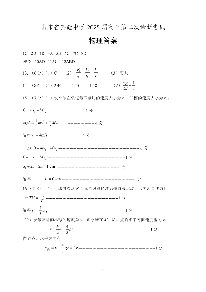 山东省实验中学2025届高三上学期11月期中考试 物理答案