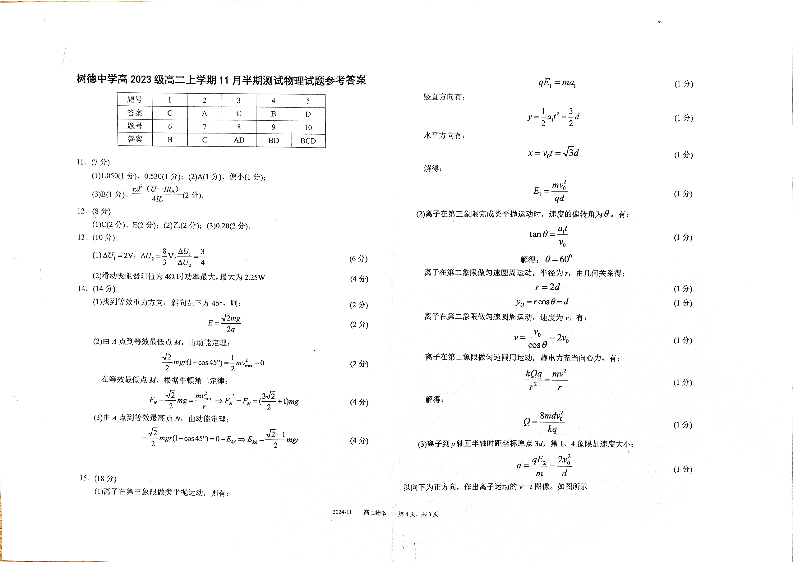 四川省成都市树德中学2024-2025学年高二上学期11月期中 高二物理 答案