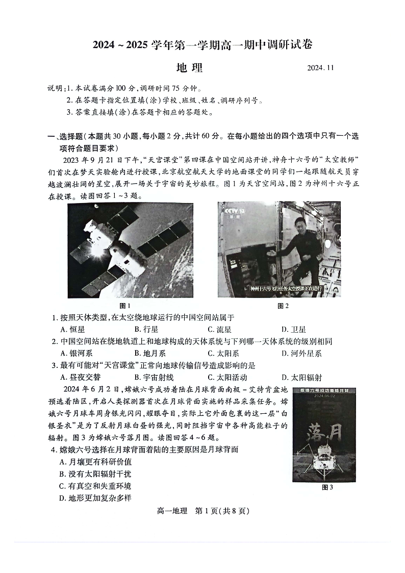 【地理试卷】苏州市2024-2025学年高一上学期期中调研考试