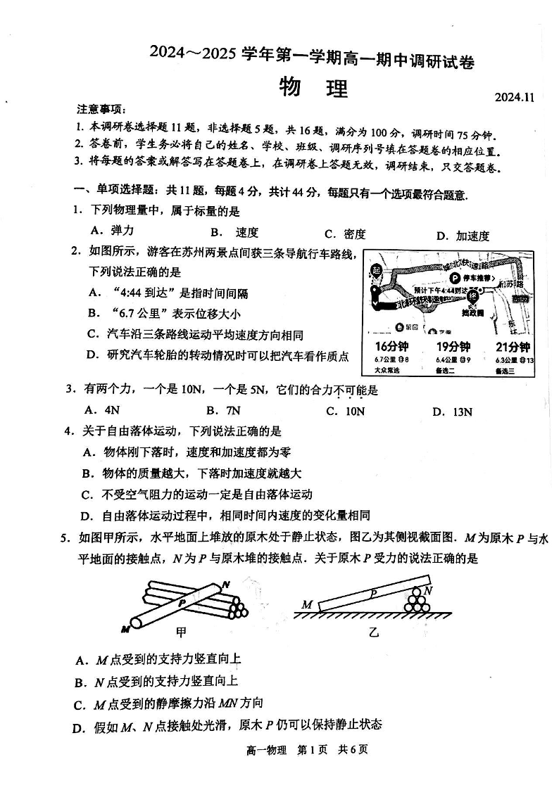 【物理试卷】苏州市2024-2025学年高一上学期期中调研考试
