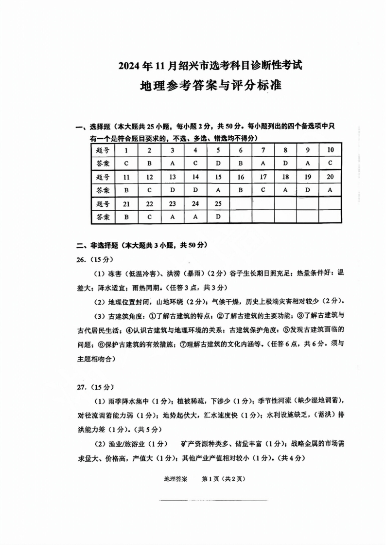 2024年11月绍兴市高考科目诊断性考试 地理答案