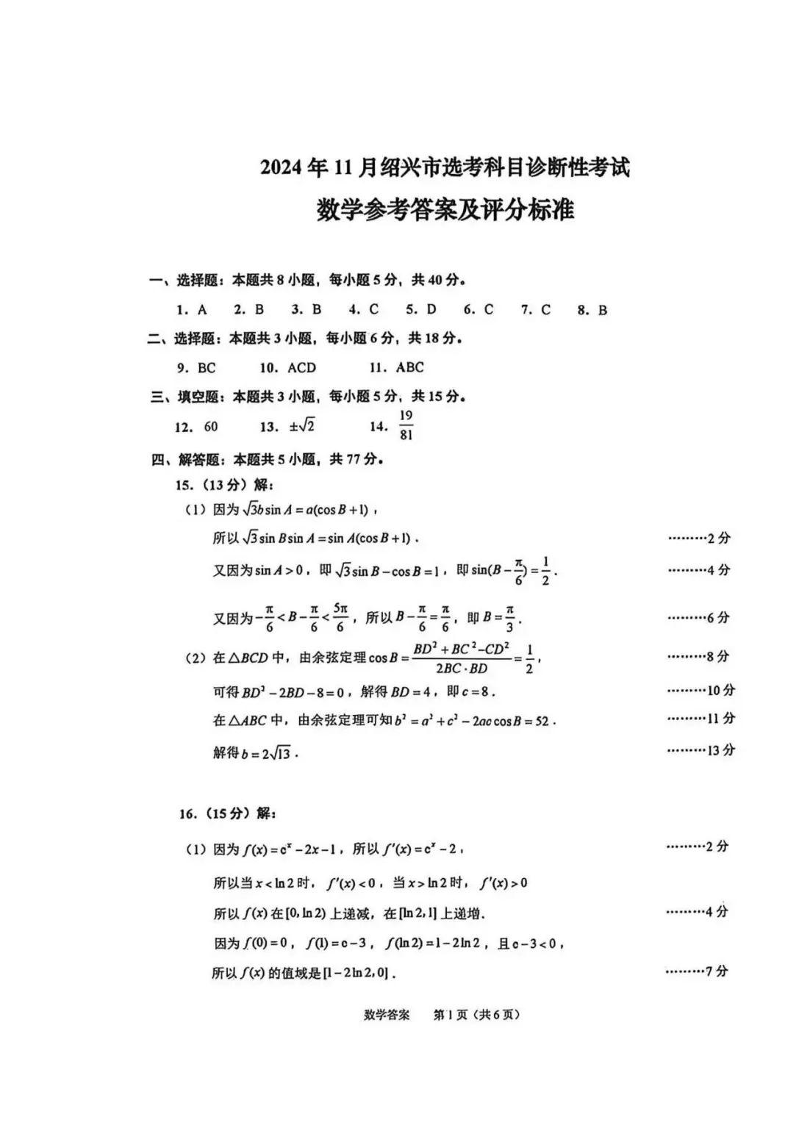 2024年11月绍兴市高考科目诊断性考试 数学答案