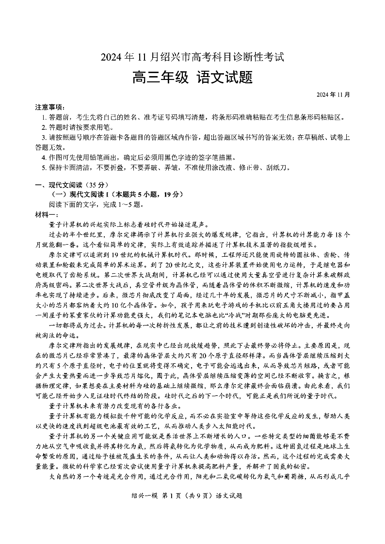 2024年11月绍兴市高考科目诊断性考试 语文