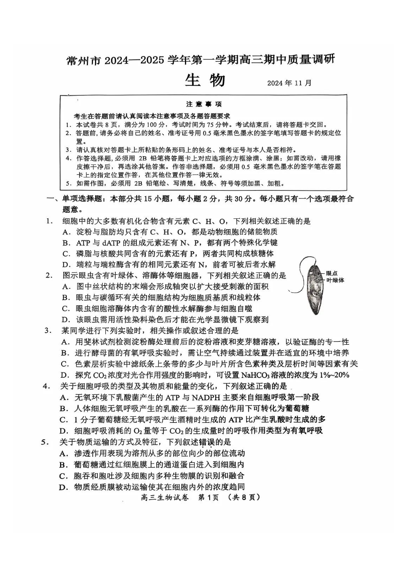 江苏省常州市2024-2025学年高三上学期期中考试 生物