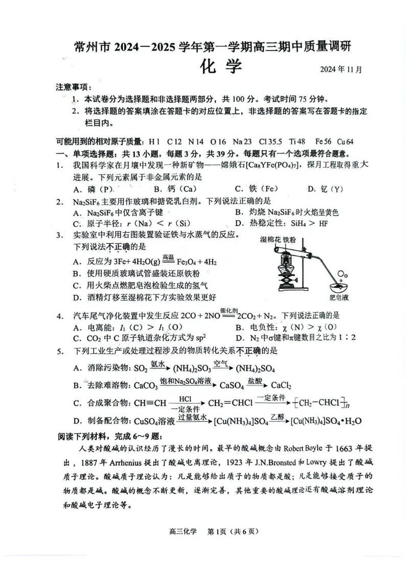 江苏省常州市2024-2025学年高三上学期期中考试 化学