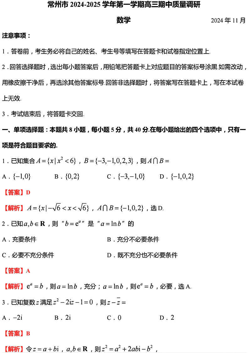 江苏省常州市2024-2025学年高三上学期期中考试 数学答案
