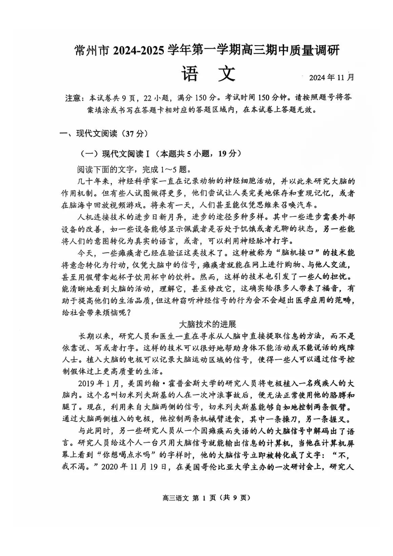 江苏省常州市2024-2025学年高三上学期期中考试 语文