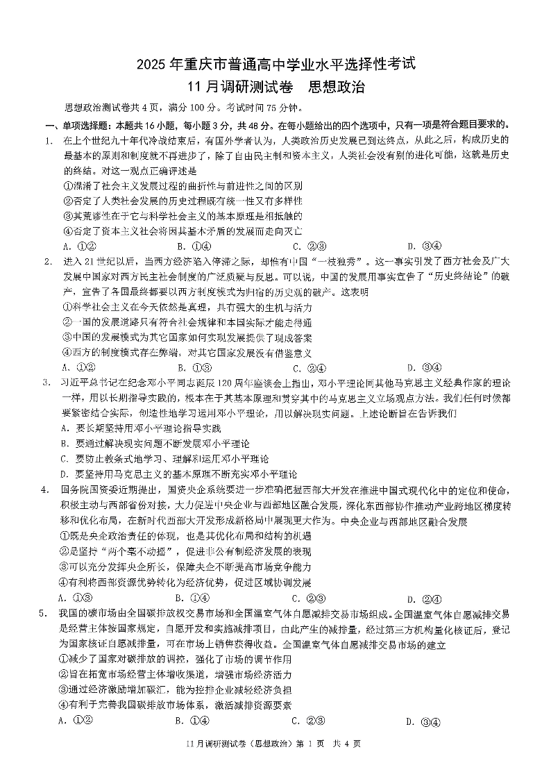 2025重庆康德半期考试 政治