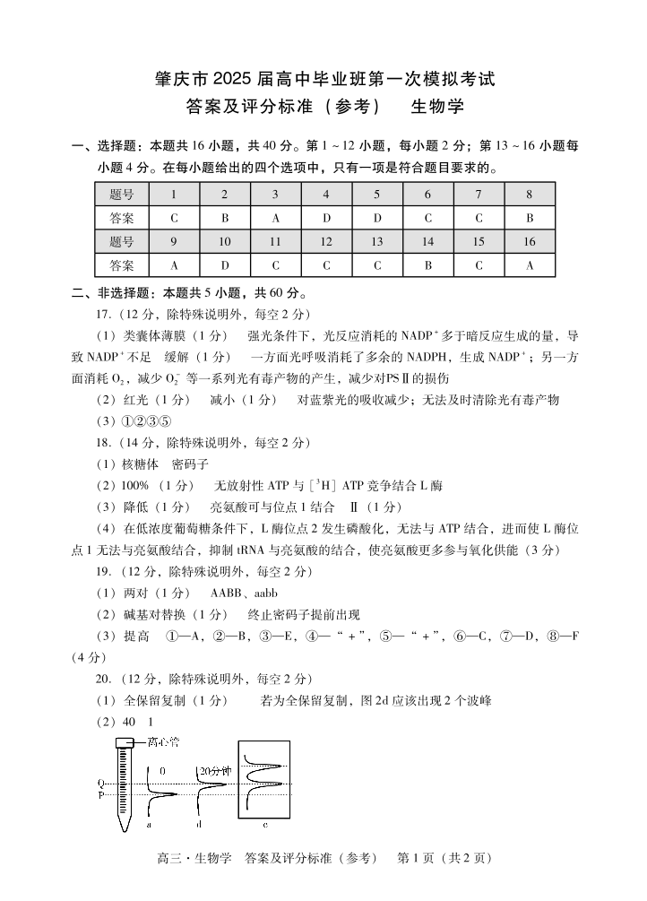 肇庆2025届高三一模·生物学答案