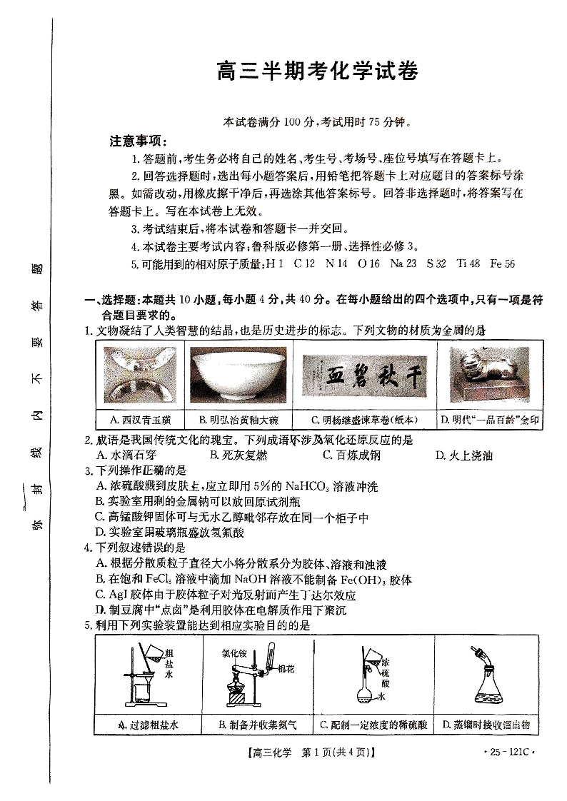 福建省部分达标高中2024-2025学年高三上学期期中考试 化学