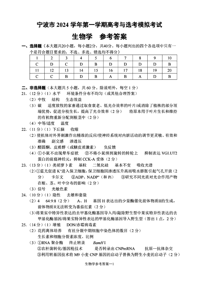宁波市2024学年第一学期高三模拟考试 生物答案