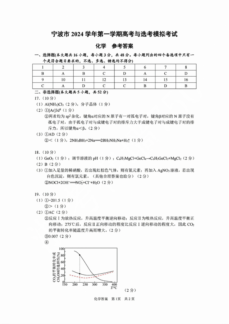 宁波市2024学年第一学期高三模拟考试 化学答案
