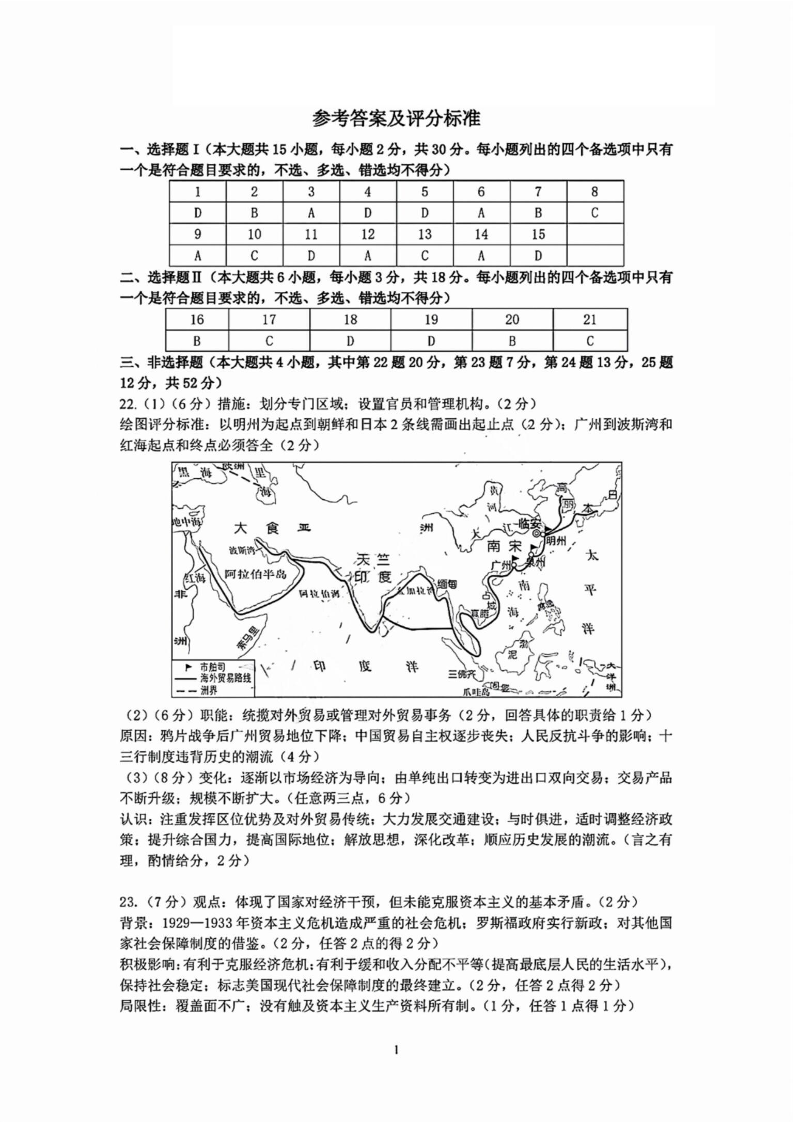 宁波市2024学年第一学期高三模拟考试 历史答案