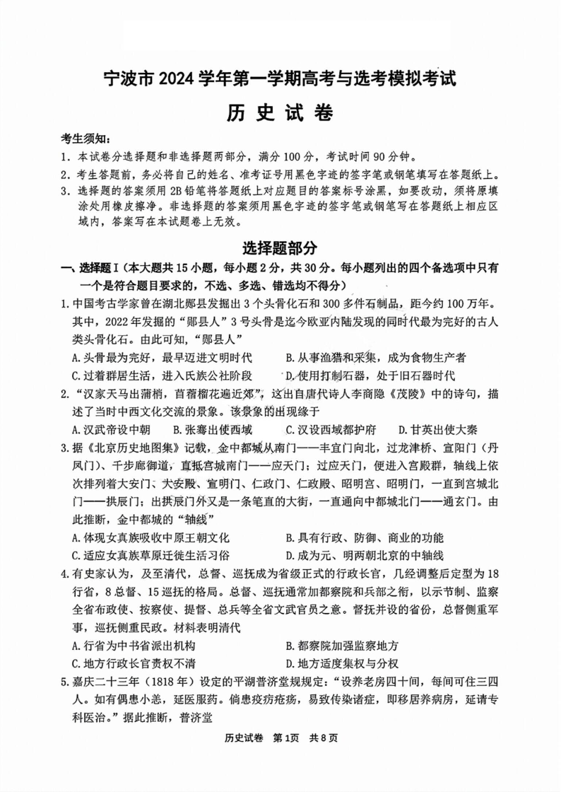 宁波市2024学年第一学期高三模拟考试 历史