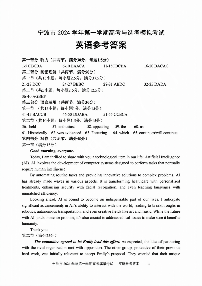 宁波市2024学年第一学期高三模拟考试 英语答案