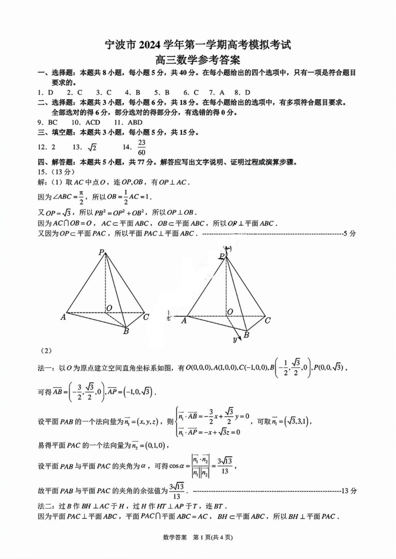 宁波市2024学年第一学期高三模拟考试 数学答案